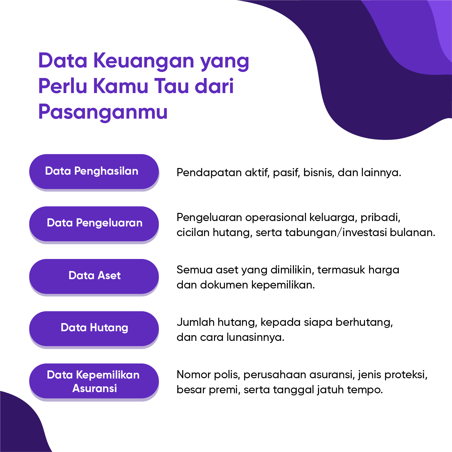 Bagi kamu yang sudah berpasangan, mengelola keuangan pribadi ketika sudah berkeluarga pasti akan bersinggungan dengan keuangan pasangan. Di sinilah kepercayaan pada pasangan diperlukan, karena dalam mengelola keuangan keluarga, informasi finansial antarpasangan perlu untuk diungkapkan. Yuk, simak ilustrasi di bawah untuk mengetahui data finansial apa saja yang perlu kamu ketahui dari pasanganmu!